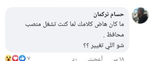 أما المواطن حسام تركمان، فدعا المحافظ الرجوب إلى مراجعة مواقفه السابقة، وعلق قائلاً:”ما كان هاض كلامك لما كنت تشغل منصب محافظ.. شو اللي تغيير ؟؟”.