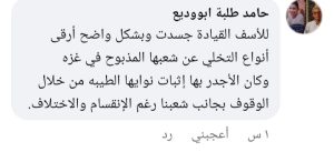 أما المواطن حامد طلبة، فرأى أن السلطة تخلت عن شعبها بشكل تام، وعلق قائلاً:”للأسف القيادة جسدت وبشكل واضح أرقى أنواع التخلي عن شعبها المذبوح في غزه ..وكان الأجدر بها إثبات نوايها الطيبه من خلال الوقوف بجانب شعبنا رغم الإنقسام والاختلاف”.