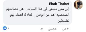 أما المواطن ايهاب ثابت، فتساءل أيضا عن سبب ضياع الوطن في دهاليز المصالح الضيقة للقيادة، وعلق قائلاً:”إلى متى سنبقى في هذا السبات .. هل مصالحهم الشخصيه اهم من الوطن .. فعلا لا انتماء لهم لفلسطين”.