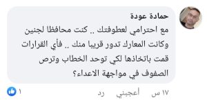 وكتب المواطن حمادة عودة موجها السؤال للمحافظ السابق، وعلق قائلا:”مع احترامي لعطوفتك .. كنت محافظا لجنين وكانت المعارك تدور قريبا منك .. فأي القرارات قمت باتخاذها لكي توحد الخطاب وترص الصفوف في مواجهة الاعداء؟”.
