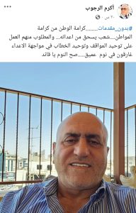 وتداول مواطنون منشورا للرجوب على منصات التواصل الاجتماعي جاء فيه:”بدون مقدمات.. كرامة الوطن من كرامة المواطن…. شعب يسحق من أعدائه… والمطلوب منهم العمل على توحيد المواقف وتوحيد الخطاب في مواجهة الأعداء، غارقون في نوم عميق….. صح النوم يا قائد”.
