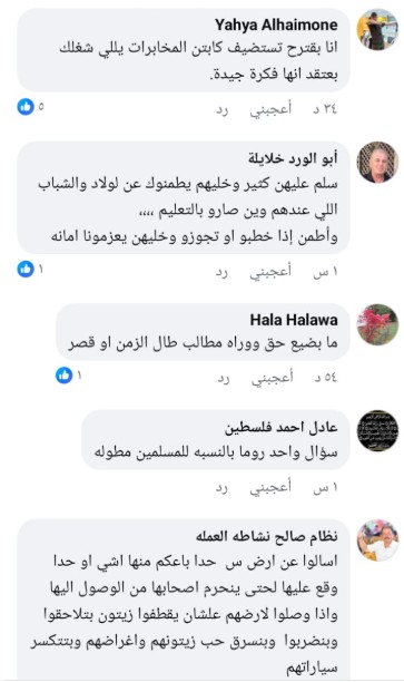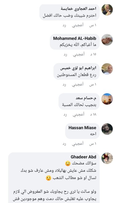 وجاءت تعليقات المواطنين على المنشور بصورة غاضبة، لا سيما وأن الشعب لا يزال يعيش حرب إبادة مستمرة منذ أكثر من عامين، ناهيك عن تصاعد لجرائم القتل والاستيطان.