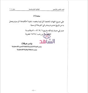 وأَضاف: “تقبل استقالة محمود عباس رئيس الوزراء اعتبارا من 6/9/2003 على أن يستمر وأعضاء حكومته في أداء عملهم كحكومة تسيير أعمال لحين تولي الوزارة مهام عملها”.