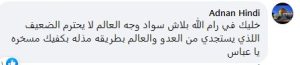 أما المواطن عدنان الهندي، فدعا عباس الى الكف عن استجداء العالم بطريقة مذلة، وعلق قائلا: “خليك في رام الله بلاش سواد وجه العالم لا يحترم الضعيف الذي يستجدي من العدو والعالم بطريقه مذله بكفيك مسخره يا عباس”.