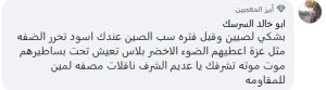أما المواطن ابو خالد السرسك، فسخر من ذهاب عباس للصين رغم أنه كان يشتمها قبل فترة، وعلق قائلا: “بشكي للصين وقبل فتره سب الصين، عندك اسود تحرر الضفه مثل عزة اعطيهم الضوء الاخضر بلاس تعيش تحت بساطيرهم موت موته تشرفك يا عديم الشرف ناقلات مصفه لمين للمقاومه”.