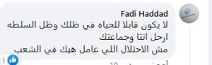 أما المواطن فادي حداد، فطلب عباس بالرحيل عن الشعب الفلسطيني بعدما تسبب بكوارث كثيرة، وعلق قائلا: “لا يكون قابلا للحياه في ظلك وظل السلطه.. ارحل انتا وجماعتك.. مش الاحتلال اللي عامل هيك في الشعب”.