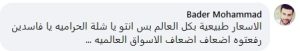 أما المواطن بدر محمد، فوصف عباس وبطانته بأنهم لصوص، وعلق قائلا: “الاسعار طبيعية بكل العالم بس انتو يا شلة الحراميه يا فاسدين رفعتوه اضعاف اضعاف الاسواق العالميه”.