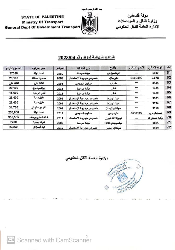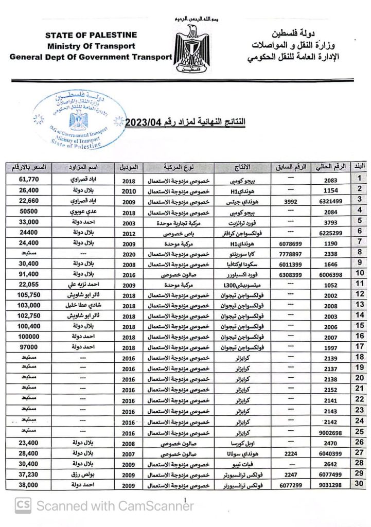 ولم يذكر المنشور عدد المركبات المبيعة بالمزاد، لكنه بين أن أعلى سعر دفع من مزاود في محافظة رام الله والبيرة بـ484 ألف شيقل، خلفه مزاود من الخليل بـ461 ألف و770 شيقل.