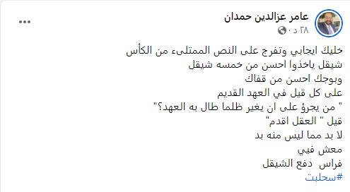 وعلق الناشط عامر عزالدين حمدان، على تجديد قررا الخصم بقوله: “خليك ايجابي وتفرج على النص الممتلئ من الكأس .. شيقل ياخذوا احسن من خمسه شيقل.. وبوجك احسن من قفاك.. على كل قيل في العهد القديم.. ” من يجرؤ على ان يغير ظلما طال به العهد؟”.. قيل ” العقل اقدم”.. لا بد مما ليس منه بد.. معش فيي.. فراس دفع الشيقل”.
