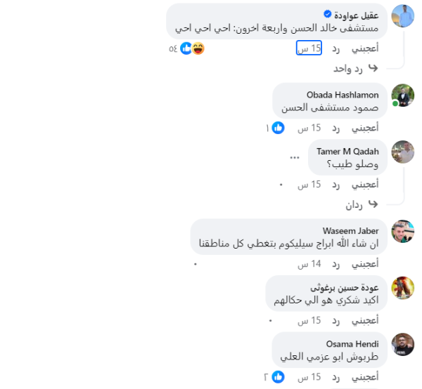 الناشط عقيل عواودة كتب تعليقًا جاء فيه: “مستشفى خالد الحسن وأربعة اخرون: احي احي احي”، فيما رد عليه الشاب محمود مشارقة: “صوامع القمح على الطريق”.