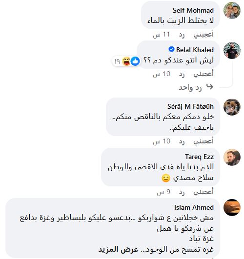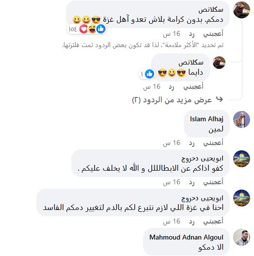 وأضاف آخر: “مش خجلانين ع شواربكو؟… بدعسو عليكو بلبساطير وغزة بدافع عن شرفكو يا همل.. غزة تباد.. غزة تمسح من الوجود”.