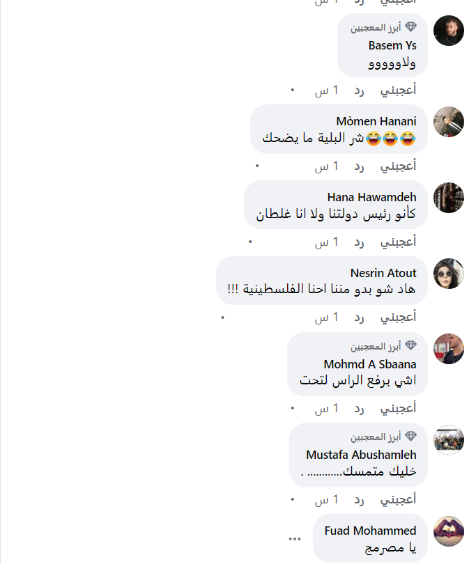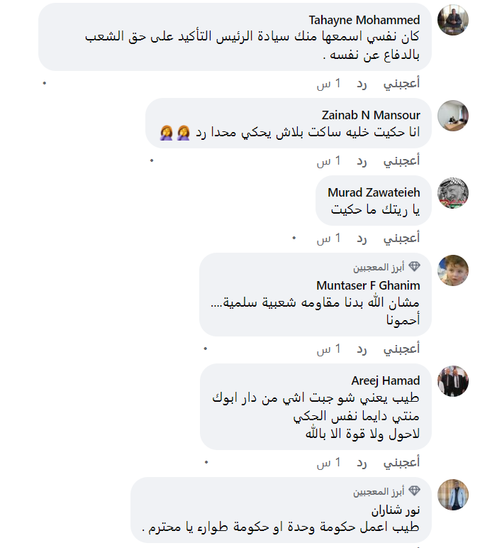فيما صعدت “جنة الورود” خطابها ضد عباس بقولها: “ومين شايلك من ارضك الكلام فقط للمقاومة”، فيما تندرت سندس أوليس: “نفسي اشوفلك وظيفة تانية بدل هالقعدة”.