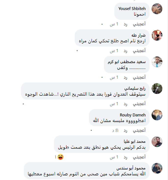 وراح هيثم جبران يقول: “مش إنت بتحدد مين يطلق سراح مين.. بس تتدخل بالحرب لوقتها فرج”، ودعت دعاء عاصي رئيس السلطة: “ارجع نام أحسن للأمة”.