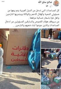 واتهم ساق الله وكوادر الحركة هذه الشخصية بفضائح والتورط بقضايا فساد وبيع وإهدار المساعدات بشكل لم يستفيد منها النازحين رغم آلاف الشاحنات التي دخلت قطاع غزة.