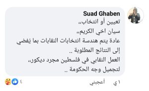 أما الناشطة النقابية سعاد غبن فعلث بقولها: “تعيين أو انتخاب،، سيان اخي الكريم،، عادة يتم هندسة انتخابات النقابات بما يُفضي إلى النتائج المطلوبة .. العمل النقابي في فلسطين مجرد ديكور،، لتجميل وجه الحكومة”.