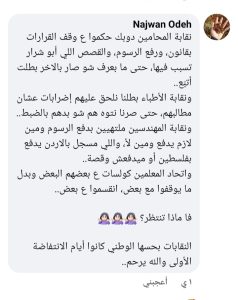 وأضافت: “ونقابة الأطباء بطلنا نلحق عليهم إضرابات عشان مطالبهم، حتى صرنا نتوه هم شو بدهم بالضبط..ونقابة المهندسين ملتهيين بدفع الرسوم ومين لازم يدفع ومين لأ، واللي مسجل بالاردن يدفع بفلسطين أو ميدفعش وقصة..واتحاد المعلمين كولسات ع بعضهم البعض وبدل ما يوقفوا مع بعض، انقسموا ع بعض.. فا ماذا تنتظر؟.