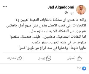 وكتب الصحفي جاد القدومي منتقداً غياب الحراك النقابي، وعلق قائلاً: “والله ما عندي اي مشكلة بالنقابات المعينة تعيين ولا الاتحادات اللي تحت الابط.. هذول فش منهم أمل، بالعكس هم جزء من المشكلة فلا يطلب منهم حل”.