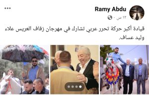 فقد كتب الحقوقي رامي عبدو تغريدة ساخرة جاء فيها: “قيادة أكبر حركة تحرر عربي تشارك في مهرجان زفاف العريس علاء وليد عساف”.