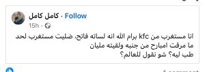 وكتب الناشط كامل كامل مستغربا وجود زبائن لدى محل كنتاكي وسط رام الله، وعلق قائلا :”انا مستغرب من kfc برام الله انه لساته فاتح، ضليت مستغرب لحد ما مرقت امبارح من جنبه ولقيته مليان.. طب ليه؟ شو نقول للعالم؟”.