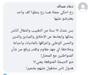 أما المواطنة دعاء عساف، فأشارت إلى ما يجري هو حصيلة ما قامت به السلطة طوال السنوات الماضية من سلخ للقيم الوطنية، وعلقت بقولها:”بس عندك ١٧ سنة من التغييب واشغال الناس بحالها وابعادها عن الاخلاق والمبادئ والدين والحس الوطني واغراقها بالماديات واحباط وملاحقة اي جهد مقاوم وتقدر ورفع من شأن المتواطئين مع المحتل! شو النتيجة المتوقعة يعني؟!.. هدول ناس مشغول عليهم بضمير!”.