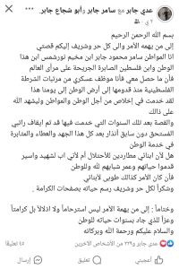 وكتب المواطن جابر في منشوره : “إلى من يهمه الأمر والى كل حر وشريف إليكم قصتي.. أنا المواطن سامر محمود جابر ابن مخيم نور شمس ابن هذا الوطن وابن فلسطين الصابرة الجريحة على مرأى العالم”.