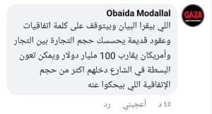 أما المواطن عبيدة مدلل، فسخر من جزئية الاتفاقيات بين التجار وتلك الشركات، وعلق قائلاً: “اللي بيقرا البيان وبيتوقف على كلمة اتفاقيات وعقود قديمة يحسسك حجم التجارة بين التجار وأمريكان يقارب 100 مليار دولار ويمكن تعون البسطة في الشارع دخلهم اكثر من حجم الإتفاقية اللي بيحكوا عنه’.