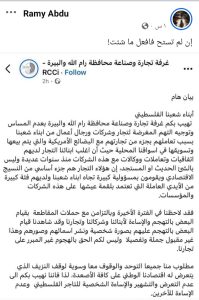 واشتمل البيان الذي أصدرته الغرفة على مغالطات كبيرة وكلمات استفزازية، حيث زعم البيان أن المقاطعة واستهداف المصالح المرتبطة بالاحتلال يضر بالاقتصاد الفلسطيني، وكأن هذا الاقتصاد قائم على تلك الحفنة من التجار.