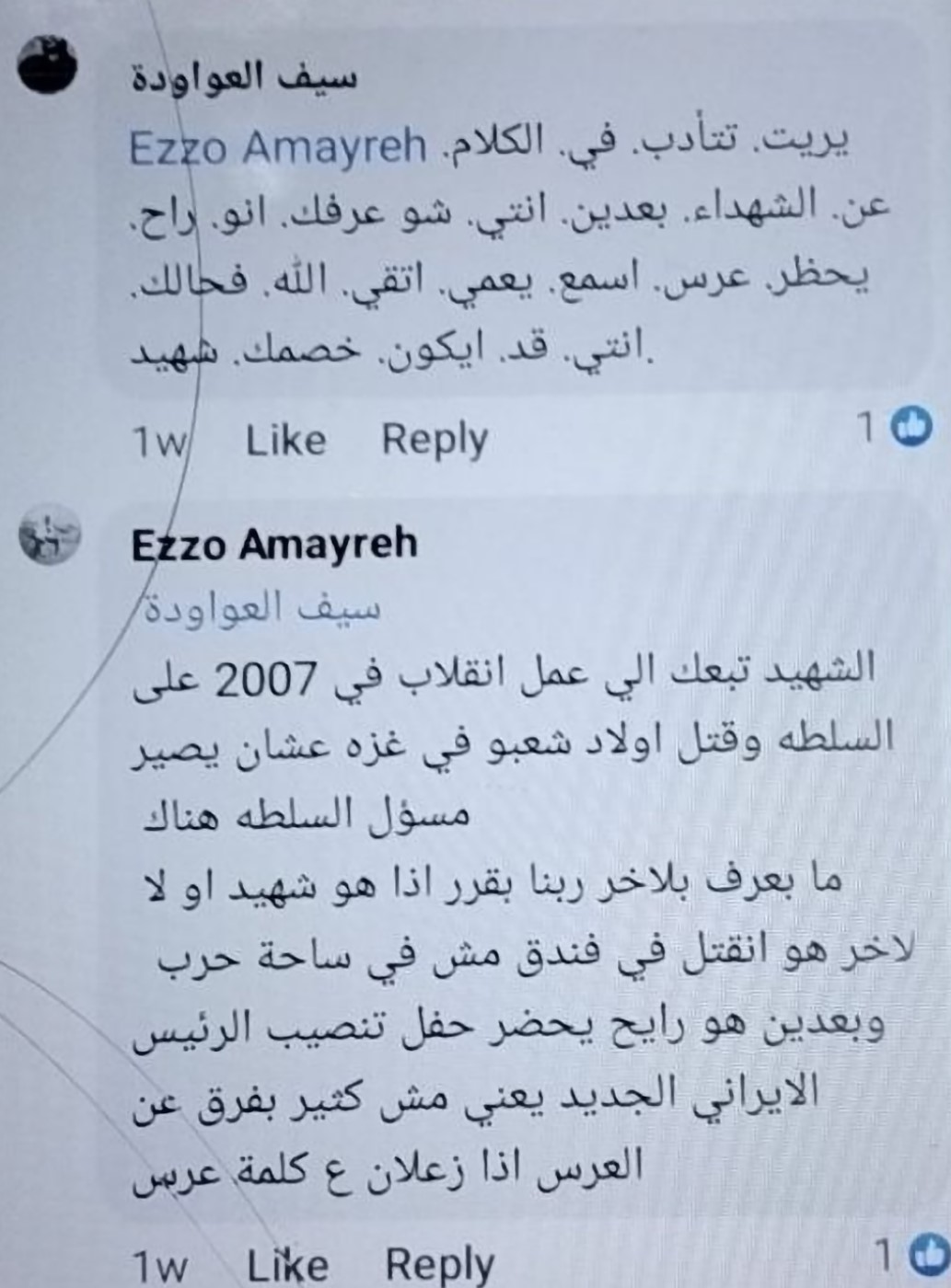 وبزر في الساعات الأخيرة شخص يدعى “عز عمايرة” من مدينة الخليل، ويعمل مرافقاً لوجيه الرجوب مدير الأمن الوقائي في أريحا، وقام بمهاجمة الشهيد هنية عبر صفحات التواصل الاجتماعي.