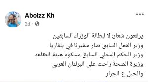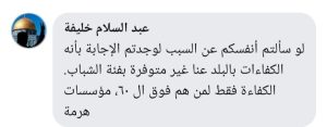 أما المواطن عبد السلام خليفة، فاختار أن يسخر من مهزلة تعيين أبو جيش سفيرا باعتباره كفاءة شابة، وعلق قائلاً:”لو سألتم أنفسكم عن السبب لوجدتم الإجابة بأنه الكفاءات بالبلد عنا غير متوفرة بفئة الشباب، الكفاءة فقط لمن هم فوق ال ٦٠، مؤسسات هرمة”.