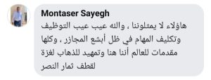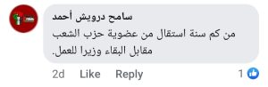 أما المواطن سامح درويش احمد، فأشار إلى انعدام المبادئ وغياب الانتماء لدى أبو جيش الذي فضل المنصب على قرار الحزب، وعلق قائلا:”من كم سنة استقال من عضوية حزب الشعب مقابل البقاء وزيرا للعمل”.