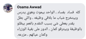 أما المواطن أسامة عواد، فرأى أن الأمر مرتبط بتغلغل الفساد في النظام السياسي للسلطة، وعلق قائلاً:”كله فساد بفساد ، الواحد بيموت وهوي يدرس وبيتخرج شباب ما بلاقي وظيفه ، واللي بطل يقدر يعطي شي بسبب التقدم بالعمر بيظلو بالوظيفة وبيترقو كمان ، الدور على بقية الوزراء وكمان عيالهم ، مزرعه”.