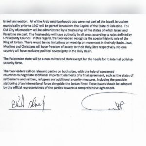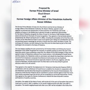القدوة وأولمرت الذين لا يشغلان حاليا أي مناصب او مواقع رسمية، ولا يملكان أي سلطة او تأثير، اتفقا من خلال الوثيقة على “العمل معًا لتعزيز تحقيق السلام بين الشعبين الفلسطيني والإسرائيلي والسلام في الشرق الأوسط بشكل عام من خلال اتفاق يتيح اقامة دولة فلسطين إلى جانب دولة إسرائيل على أساس حدود عام 1967، بحيث يعيش الشعبان في سلام وأمان على أساس الاعتراف المتبادل”، كما جاء في الوثيقة.