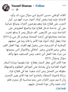 وكتب الناشط شناعة منشورا جاء فيه: “القائد الوطني حسين الشيخ لدي سؤال بريء لك وأود الإجابة عليه (بما يخص أولاد أخوك حيث أنهم من أول الحرب على قطاع غزة وهم يفرضون أتاوات ومبالغ خيالية على أي شاحنة تدخل قطاع غزة والمبلغ المفروض على الشاحنة يزيد عن الأربعين الف شيكل ومن لا يدفع تخرب بضاعته بمخازنها في أرضنا المحتلة ويخسر كل شيء) ؟؟؟!!”.