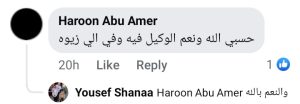 أما المواطن هارون ابو عامر، فدعا بالهلاك على حسين الشيخ وأمثاله من تسببوا بالنكبات للشعب الفلسطيني، وعلق قائلا:”حسبي الله ونعم الوكيل فيه وفي الي زيوه”.