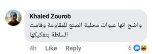 وكتب المواطن خالد زوروب، مكذباً صفحة قناة عودة بشأن طبيعة العبوات المفككة، وعلق قائلاً:”واضح انها عبوات محلية الصنع للمقاومة وقامت السلطة بتفكيكها”.
