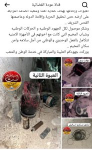 حساب قناة عودة التابعة لحركة فتح على منصة فيسبوك كتب منشورا يحتوى على كذب صراح، يزعم فيه أن أهالي طولكرم يقدمون الشكر لأجهزة أمن السلطة على تفكيكها بعبوات ناسفة زرعها الاحتلال في أحد مناطق المخيم.
