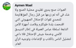 كما حاولت الصفحة تجميل الخيانة الوطنية التي تمارسها أجهزة أمن السلطة يومياً عبر تفكيك وتفجير عبوات المقاومة المزروعة من أجل التصدي للاحتلال، وذلك بالزعم أن الأهالي هم من يقومون بالابلاغ عنها.