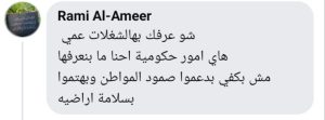 أما المواطن رامي الأمير، فدعا بسخرية إلى ترك التعويل على الحكومة، وعلق قائلاً:”شو عرفك بهالشغلات عمي.. هاي امور حكومية احنا ما بنعرفها.. مش بكفي بدعموا صمود المواطن وبهتموا بسلامة اراضيه”.