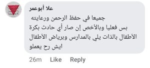 أما المواطنة علا ابو عمر، فتحدثت عن مخاوفها على الفئات الضعيفة والهشة من احتمال أي تصعيد قادم، وعلق قائلاً:”جميعا في حفظ الرحمن ورعايته .. بس فعليا وبالأخص إن صار أي حادث بكرة الأطفال بالذات يلي بالمدارس وبرياض الأطفال ايش رح يعملو”.