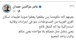 وكتب الناشط عامر حمدان، معلقاً على غياب أي دور حكومي في الفترة الراهنة، وعلق قائلاً:”بعينهم الله حكومتنا بس يطلعوا يعطوا شوية تعليمات لسكان القرى القريبة من المستوطنات، شو في اجراءات وقائية استدراكية بما انه الشغل فاتح.. يعني بنضل متل شعبكم بلا مؤاخذه يعني منكم.. والرب ياخد الجميع”.