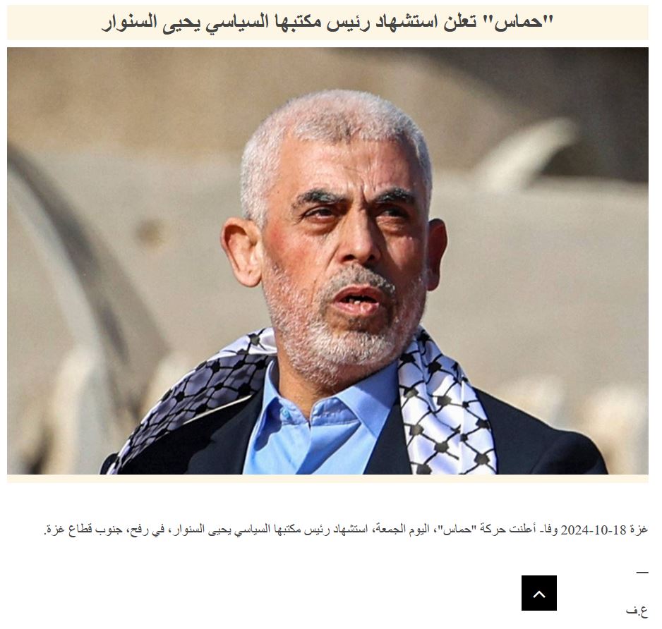 وجاء نص الخبر الذي عنونته الوكالة بـ”حماس تعلن استشهاد رئيس مكتبها السياسي يحيى السنوار”، “أعلنت حركة “حماس”، اليوم الجمعة، استشهاد رئيس مكتبها السياسي يحيى السنوار، في رفح، جنوب قطاع غزة”.