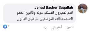 أما المواطن جهاد ساق الله، فدعا الحكومة للوفاء بالتزاماتها قبل أن تطالب المواطنين بذلك، وعلق قائلاً: “انتم تعتبرون انفسكم دوله وقانون ادفعو الاستحقاقات للموضفين ثم طبق القانون”.
