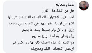 أما المواطن عصام شعابنة، فعبر عن رفضه للقرار، وعلق قائلاً:”هل من اتخذ هذا القرار اخذ بعين الاعتبار تلك الطبقة العاملة والتي لها اكثر من اربعة عشر شهرا في البيت دون مصدر رزق او دخل ولو بسيط يسد حاجتهم ولم ينظر لهم احد او يهتم بهم.. مع العلم انه هذه الطبقة كان لها دور كبير في ازدهار اقتصاد البلد وتحريكه”.