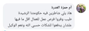 أما المواطنة ام حمزة العدرة، فطالبت الحكومة بتوفير فرص عمل للعمال والعاطلين قبل أن يقرروا حبس أصحاب الشيكات المرتجعة، وعلقت بالقول:”هاذ يلي شاطرين فيه حكومتنا الرشيدة.. طيب وفروا فرص عمل للعمال اقل ما فيها علشان يدفعوا للشكات حسبي الله ونعم الوكيل”.