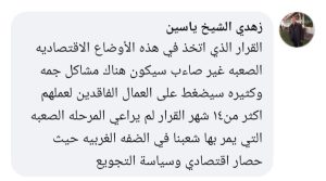 أما زهدي الشيخ ياسين، فأكد أن القرار لم يراعي الأوضاع الصعبة التي يعيشها المواطنون، وعلق قائلا:”القرار الذي اتخذ في هذه الأوضاع الاقتصاديه الصعبه غير صاءب سيكون هناك مشاكل جمه وكثيره سيضغط على العمال الفاقدين لعملهم اكثر من١٤ شهر القرار لم يراعي المرحله الصعبه التي يمر بها شعبنا في الضفه الغربيه حيث حصار اقتصادي وسياسة التجويع”.