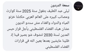 أما المواطن سمعة الدردون، فسخر من سوء اتخاذ هذا القرار، وعلق قائلاً:”ليلى عبد اللطيف بتقول سنة 2025 سنة كوارث ومصائب كبيره على العالم العربي حكتلنا خزنو المياه والدواء والغذاء مش سددو الديون”.