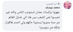 أما محمد يوسف، فأكد أن هذا القرار يعني زج الآلاف في السجن ، وعلق قائلا:”جهزوا بركسات عشان تستوعب الناس والله غير تحبسوا نص الشعب بس هاد الي ضايل العالم من سنه بدوروا يستروا حالهم ولي اصدر هالقرار شكله من سويسرا”.