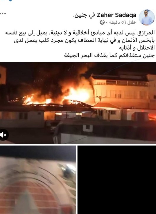 وخرج الشبيح زاهر صدقة ليحرض على المقاومة عبر صفحته على فيسبوك قائلاً: “المرتزق ليس لديه أي مبادئ أخلاقية ولا دينية، يميل إلى بيع نفسه بأبخس الأثمان، وفي نهاية المطاف يكون مجرد كلب بعمل لدى الاحتلال وأذنابه”.