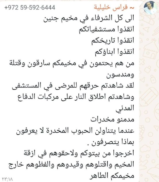 فيما كتب الشبيح فراس خليلية: “إلى كل الشرفاء في مخيم جنين أنقذوا مستشفياتكم، أنقذوا تاريخكم، أنقذوا أبناؤكم”.