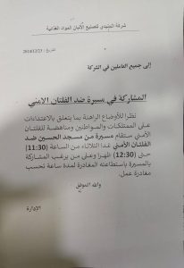 لكن ولأنها جزء من منظومة الفساد الكبيرة المرتبطة بالسلطة، أعلنت الشركة لموظفيها بضرورة المشاركة في وقفة ضد المقاومة في جنين ولإسناد أجهزة السلطة في عدوانها.